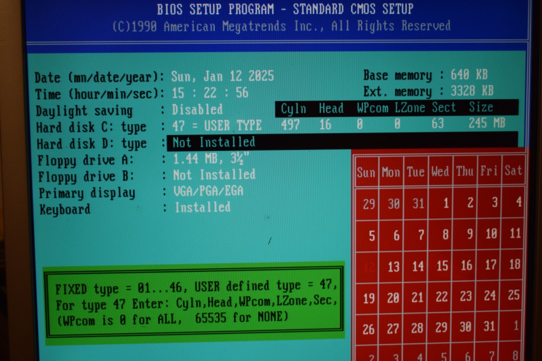 Sur les machines anciennes, le BIOS joue un rôle très important. A l'époque, il y a peu de mécanismes d'auto-configuration. Par exemple, quand on ajoute un disque dur, il faut l'indiquer dans le BIOS et configurer sa géométrie. Soit en utilisant des géométries déjà référencées dans le BIOS (selon ce que la boîte responsable du BIOS a mis dans l'EPROM), soit on utilise le type 47 qui permet à l'utilisateur de déclarer la géométrie manuellement.